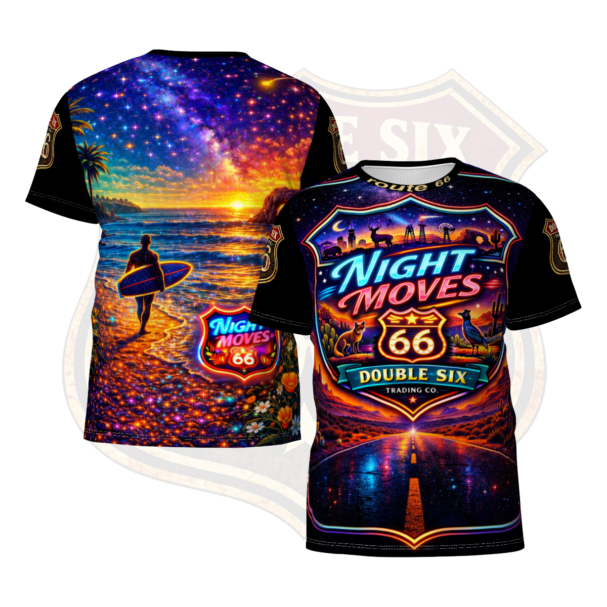 Night Moves captures the quiet beauty of the Route 66 countryside after dark — where open roads, distant towns, and desert skies come alive in neon color. Blending natural landscapes with electric glow, each design transforms familiar scenes into something bold and unforgettable. Developed as a full state-specific collection across all eight Route 66 states, Night Moves offers a premium, eye-catching series that stands out on the rack and draws customers in.