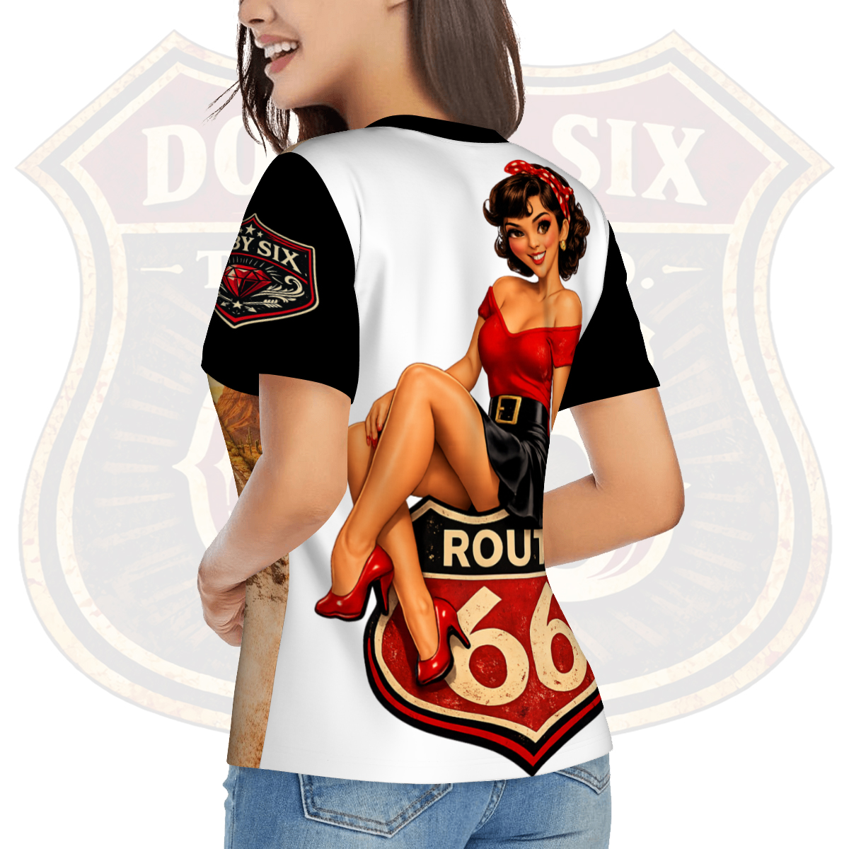Ruby Six is an original Double Six character inspired by the classic pin-up era of the 1940s and 1950s — reimagined for the open road. She represents the free spirit of Route 66, showing up across the Mother Road in state-specific designs that reflect the places travelers love most. More than a graphic, Ruby Six is a collectible personality that customers recognize, remember, and come back for.